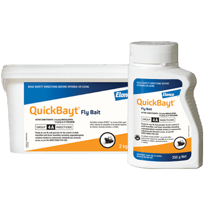 QuickBayt Fly Bait is a ready-to-use, sugar-based fly granule containing the fast-acting neonicotinoid insecticide, imidacloprid. Imidacloprid is an insect neurotoxin that effectively kills the adult house fly (Musca domestica) and the lesser housefly (Fannia canicularis), including organophosphate resistant strains.