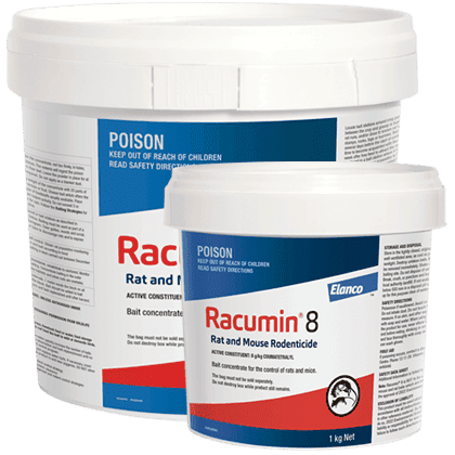 Racumin 8 is a concentrated, rodenticide powder to control rats and mice. It contains coumatetralyl, a first-generation anticoagulant that works as a multi-feed bait. This decreases the risk of secondary poisoning to pets or wildlife who may scavenge on the poisoned rodents¹,². Due to the multi-feed action, Racumin will kill in a similar timeframe to a single-feed bait without the risk of bait shyness.