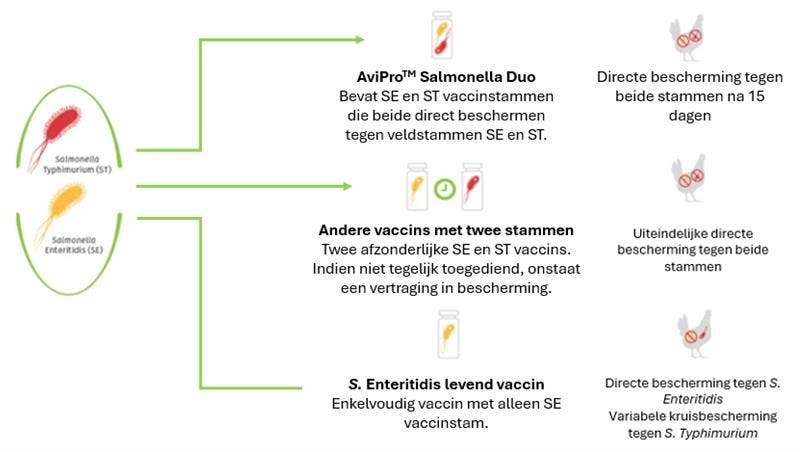 Vaccinatie tegen beide stammen biedt bescherming tegen Salmonella-infecties bij pluimveestapels.