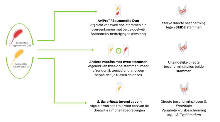 AviPro TM SALMONELLA DUO : Eén dosis bevat levende verzwakte S. Enteritidis-bacteriën, minimaal 1 x 10⁸ CFU en maximaal 6 x 10⁸ CFU. Levend verzwakt S. Typhimurium-bacteriën, min. 1x10⁸ CFU en max. 6x10⁸ CFU.