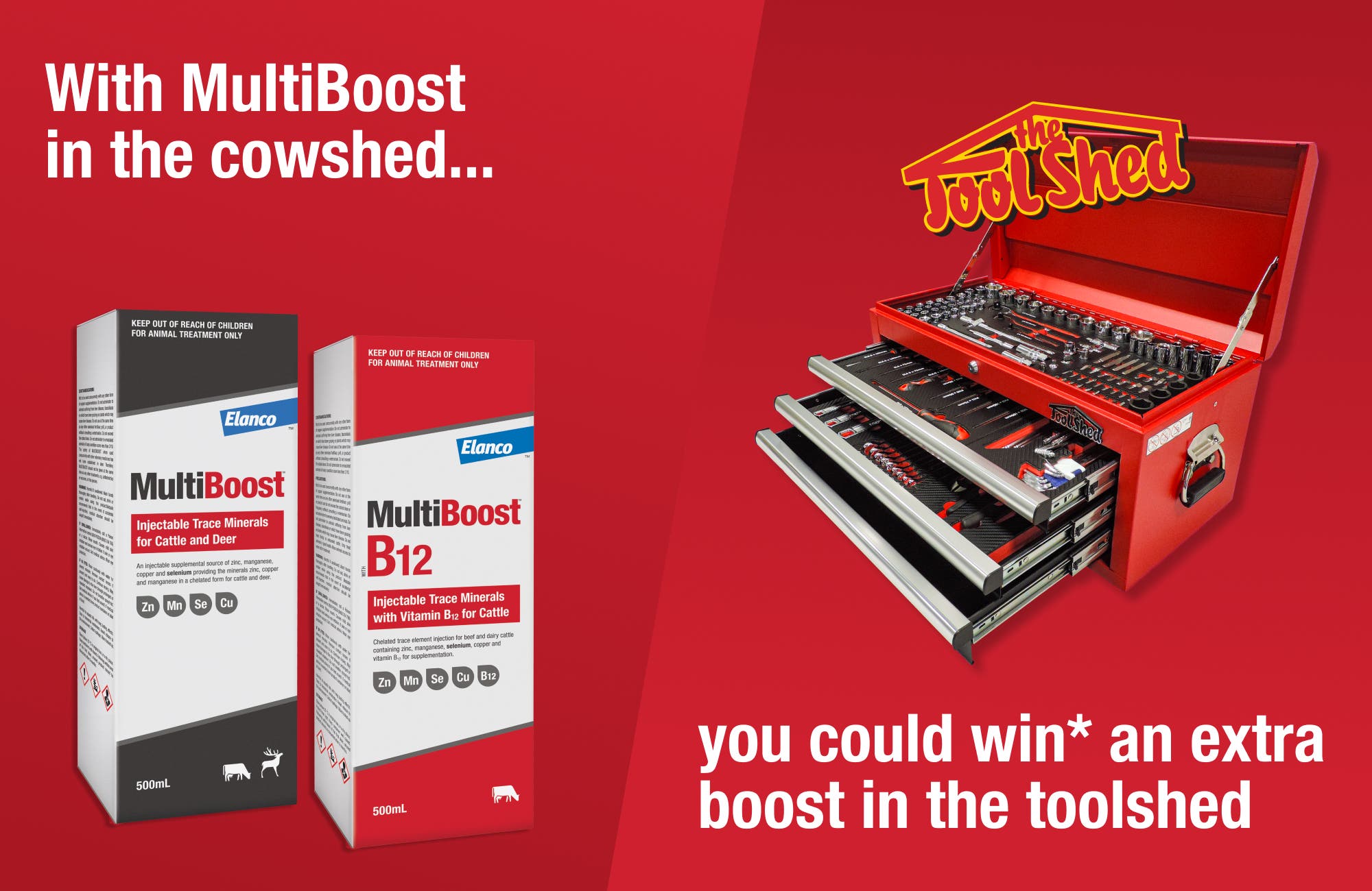 Maximise the productivity of your herd with Elanco MultiBoost supplements, and you could be maximising your productivity in the toolshed with a FREE ToolShed tool chest^, valued at $1,030, complete with tools that carry a lifetime warranty.*