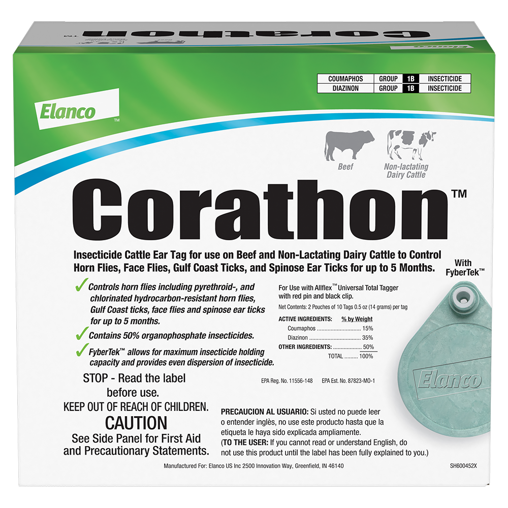 Corathon is an insecticide cattle ear tag with FyberTek for the control of face flies, horn flies, Gulf Coast ticks and spinose ear ticks on both beef cattle and non-lactating dairy cattle.