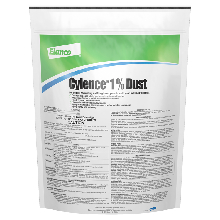 CyLence 1% Dust is used for control of crawling and flying insect pests in poultry facilities. Ready-to-use dust formulation. For use in and around poultry houses. Apply this product only as specified on this label.