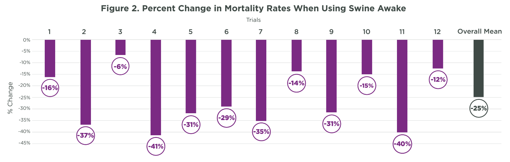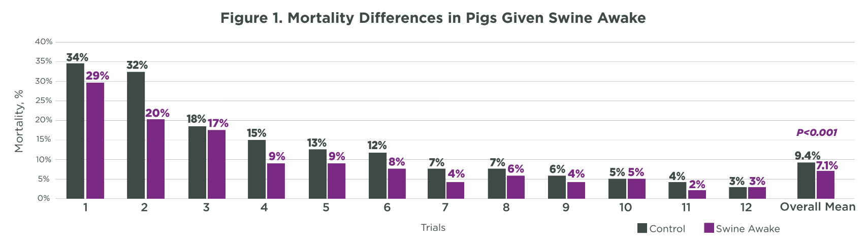 5Bretey K, Song R, Chang P. Impact of NutriQuest Swine AwakeTM administration to weaned pigs on pig livability. 50th Annual Meeting of the American Association of Swine Veterinarians proceedings. 2019; 214-15.